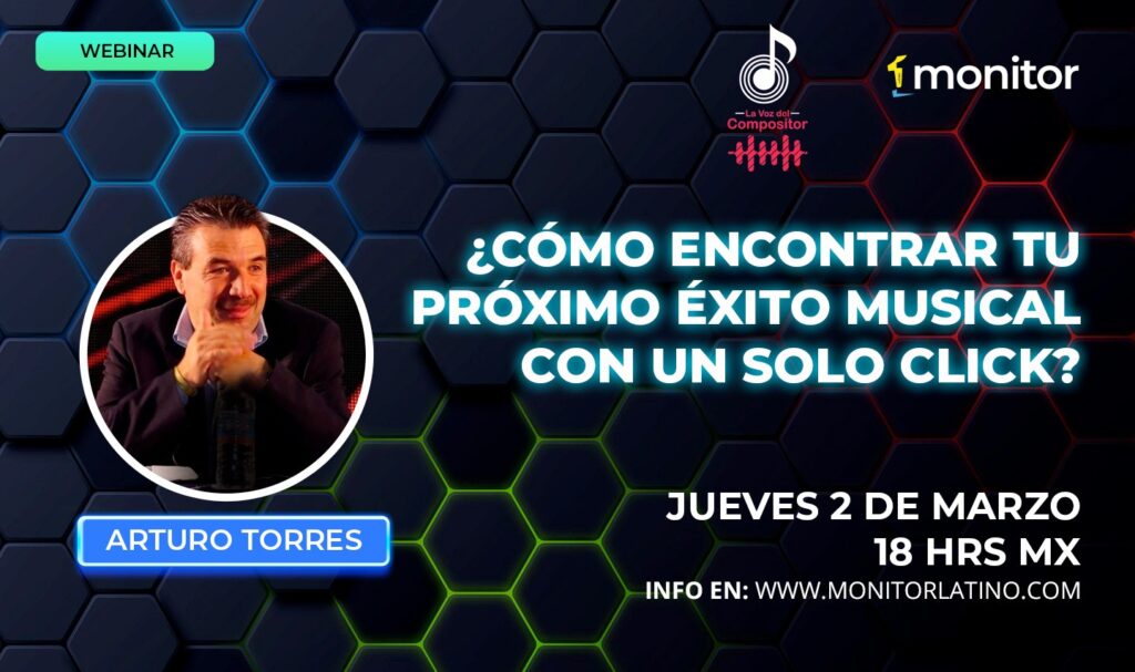 Pero, ¿cómo encontrar esas canciones? Arturo Torres nos hablará al respecto en el seminario «¿Cómo encontrar tu próximo éxito musical con un solo click?», el segundo de una serie que este año presentará monitorLATINO.